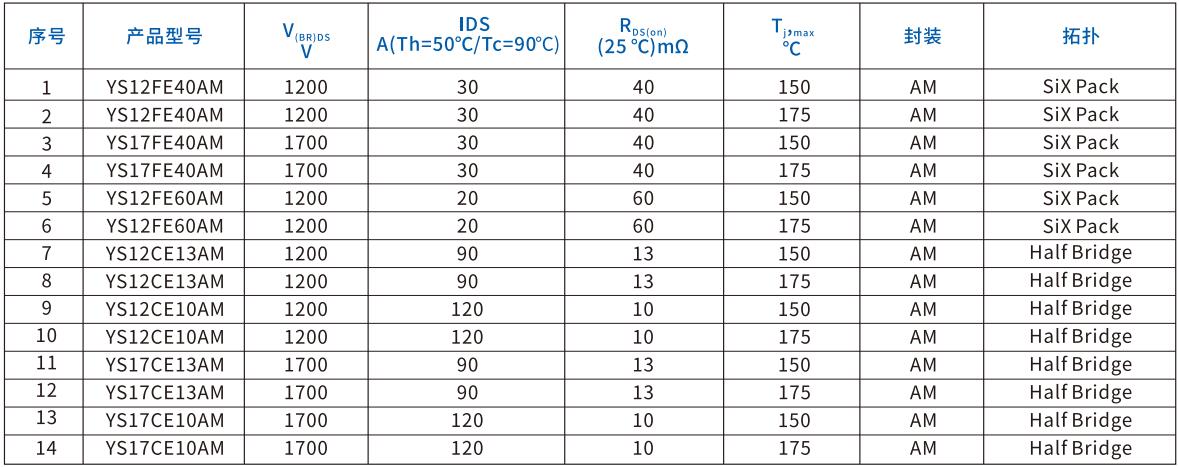 針對小功率應(yīng)用場合,元山電子開發(fā)了六合一封裝集成的AM系列封裝系列產(chǎn)品,可用于充電樁、白色家電等領(lǐng)域,該產(chǎn)品的主要規(guī)格有1200V/1700V,30Arms~200Arms;采用全SiC功率芯片,無底板設(shè)計、具有高頻高效、低熱阻。