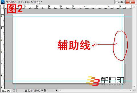 2、 在新建文檔中顯示標尺(視圖—標尺),然后拖拉輔助線,把出血用輔助線標示出來,如此,設(shè)計的時候才有一個清晰的設(shè)計范圍哦。如圖2所示。有時為了輔助線的準確性,可以放大圖像進行拖拉輔助線,相對會準確好多。