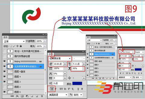 9、 然后在如圖9所示位置放上自己公司名稱,字體大小如圖中所示,或者根據(jù)自己公司名稱長短靈活設(shè)置字體大小、顏色、字符間距、英文名稱字體大小等等。